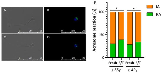 Fluorescence patterns of human spermatozoa stained with PSA (green) for the analysis of acrosome status. DAPI (blue) was used to label sperm in the nucleus. Effect of APA and cryopreservation on acrosome status. (B,D). Images (A,C) Differential interference contrast. Scale Bars: 25 µm. (E) Percentage of acrosome reaction in non-APA group (fresh and frozen) and APA group (fresh and frozen). A total of 14 semen samples for the non-APA group and 10 samples for the APA group were analyzed during the experiment. IA (orange): intact acrosome cells; RA (green): reacted Acrosome cells. Values are mean percentage ± SD. * p < 0.05.