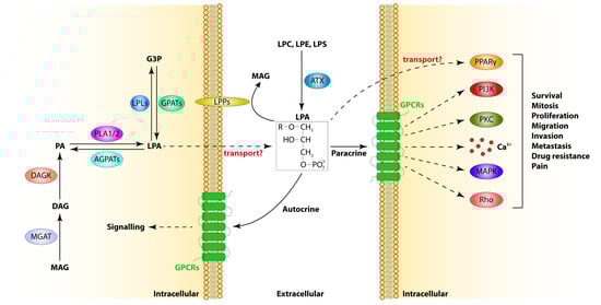 LPA that is either secreted or synthesised extracellularly can interact with LPA receptors (LPARs) in an autocrine or paracrine manner. The presence of LPA in the plasma also suggests that it potentially affects remote anatomical locations, insinuating the existence of hormone-like functions for this phospholipid.