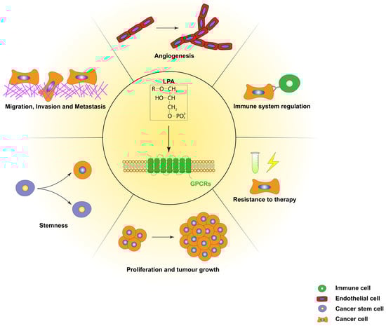 LPA regulates many hallmarks of cancer. LPA acts through cognate G protein-coupled receptors (GPCRs), termed LPA receptors (LPARs), to promote subcellular signalling that ultimately leads to enhanced tumour aggressiveness through induction of processes like angiogenesis, inhibition of anti-tumour immunity, proliferation and tumour growth, cancer stemness, migration, invasion and metastasis.