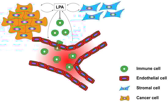 Interplay between LPA and the TME. LPA is not only produced by cancer cells but also by stromal and endothelial cells. Moreover, LPA functions beyond a cell-autonomous manner, and when produced by one cell type, it can also regulate the fate of different cell types in the TME.
