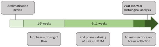 Mice were bred commercially (Charles River, Margate, UK) in multi-cage isolators on positive pressure and under specific pathogen-free (SPF) conditions. After weaning, they were maintained in isolators in shoe boxes with siblings and aged until appropriate for the experiment with ad libitum access to water and food chow. For acclimatization, the mice were delivered (air and truck) to the Animal Facility of the Nencki Institute (Warsaw, Poland) one month before the start of the experiment. They were housed, according to the genotype, in small colonies of up to 5 mice in a single cage (Type III, 382 × 220 mm). The cage lining included corn cobs, strips of paper, and cardboard tubes as an enrichment. The holding rooms were maintained at a constant temperature (20–22 °C), humidity (60–65%) and the air exchange rate (17–20 changes/h), with a 12 h light/dark cycle (lights on at 6 a.m.). The animals had free access to food and water. In alignment with previous studies, female mice were 19 to 27 weeks old at the start of the experiments [36]. Animals were assigned to treatment groups based on their body weights determined prior to drug administration to have an equal mean body weight for each treatment cohort. In addition, the body weights were recorded weekly during the in-life phase of dosing, and on the final day prior to necropsy. After each drug dosing, the animals were observed for adverse effects for up to 4 h. Clinical signs were recorded and, where possible, assessed for severity by non-invasive screening [37]. Three mice were terminated prematurely due to poor tolerance of the gavaging process/weight loss. No other clinical signs were observed in the remaining animals. Additional behavioral observations were performed during the first two weeks of drug administration in both the first and second phases of the study (Figure 1). This included an assessment of motor activity, changes in reactivity, hind limb standing, freezing and altered social behavior (isolation/dominance) [37]. Transient behavioral anomalies were noted for both HMTM and rivastigmine administrations. Their frequency was irregular and very rare.