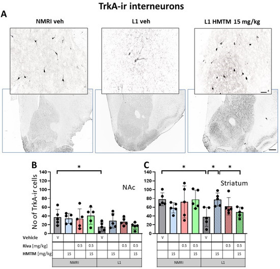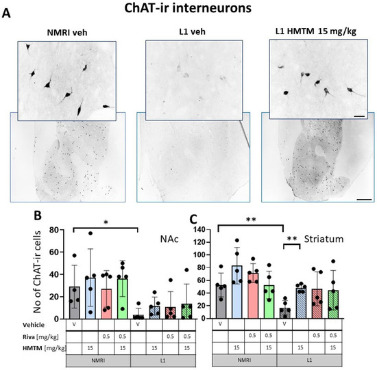Choline acetyltransferase (ChAT) immunohistochemistry in the basal forebrain interneurons of wild-type and L1 mice. The core groups were treated as indicated with the vehicle, HMTM, rivastigmine or a combination of the two compounds. (A) Representative images of the ChAT immunohistochemical staining of interneurons. Sums of ChAT-ir interneurons counted in (B) the nucleus accumbens and (C) striatum. Values are presented as the mean ± SD with scatter plots of individual data. (B) For interneurons in the nucleus accumbens, a factorial two-way ANOVA confirmed a significant main effect of the genotype (F(1,31) = 18.2; p = 0.0002). No other term was reliable. L1-Veh mice presented with strongly reduced ChAT labeling (t = 2.8, df = 7, p = 0.026) relative to WT. (C) For interneurons in the striatum, statistical analysis yielded the main effects of the genotype (F(1,32) = 14.6; p = 0.00006) and treatment (F(3,32) = 3.9; p = 0.018), but no interaction. The mean number of the ChAT-ir neurons was reduced in L1-Veh by 75% (t = 3.7, df = 8, p = 0.006 relative to WT-Veh). While there was a substantial loss of ChAT labeling in L1 mice relative to NMRI, this phenotype has been recovered when HMTM is administered. The combination of rivastigmine and HMTM did not lead to added benefits. Statistical significance between the groups was calculated using the Newman–Keuls test (* p < 0.05, ** p < 0.01). Scale bars: 100 μm for the basic microphotographs and 50 μm for the insertions; n = 5 for all groups.