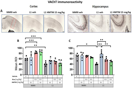 Vesicular acetylcholine transporter (VAChT) immunohistochemistry in the cortex and hippocampus of wild-type and L1 mice. The core groups were treated as indicated with the vehicle, HMTM, rivastigmine or a combination of the two compounds. (A) Representative images of the VAChT immunohistochemical staining in the motor cortex (left panel) and the CA3 field of hippocampus (right panel). Mean relative optical density (mean ROI) of the VAChT staining in (B) the motor cortex and (C) hippocampal CA3. Two-way ANOVAs indicated a significant difference between the groups in (B) the cortex (F(7,31) = 63.5, p < 0.0001) and (C) hippocampus (F(7,30) = 20.8, p < 0.0001), with the main effects of treatment and interactions observed (cortex—treatment: F(3,31) = 4.3; p < 0.013, interaction: F(3,31) = 4.7; p = 0.008; hippocampus—treatment: F(3,30) = 11.25; p < 0.0001, interaction: F(3,30) = 7.6; p = 0.0007). A two-tailed planned comparison confirmed the cortex phenotype between the vehicle groups of WT and L1 (t = 3.8, df = 7; p = 0.007). Additionally, for the hippocampus, the VAChT-ir phenotype was confirmed for the L1-Veh groups relative to the WT-Veh (t = 5.2, df = 7; p = 0.0013). (B) No recovery of VAChT-positive neurons was observed in the cortex of L1 across all HMTM treatment groups. However, the control groups treated with rivastigmine or with a combination of rivastigmine and HMTM had elevated levels of the mean ROI. (C) For the hippocampus, there was a clear recovery of VAChT-ir in the HMTM L1 group (t = 6, df = 7; p = 0.0005). The same effect was observed in L1 groups treated with rivastigmine (t = 4.3, df = 7; p = 0.003) and a combination of both compounds, but this effect was weaker than for HMTM. Treatments did not affect levels in the control mice. Statistical significance between the groups was calculated using the Newman–Keuls test (* p < 0.05, ** p < 0.01, *** p < 0.001). Values are presented as the mean ± SD with scatter plots for individual data. Scale bars: 200 µm for cortex microphotographs and 100 µm for hippocampus microphotographs. For the WT-Veh and WT-Combo groups n = 5; for the L1-Veh and L1-Combo groups n = 4; for the WT-Riva, L1-LMTM and L1-Riva groups n = 3.
