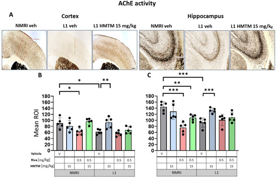 Acetylcholinesterase (AChE) activity in the cortex and hippocampus of wild-type and L1 mice. The core groups were treated as indicated with the vehicle, HMTM, rivastigmine or a combination of the two compounds. (A) Representative images of AChE activity in the motor cortex (left panel) and for the CA3 of the hippocampus (right panel). The mean relative optical density (mean ROI) of AChE staining in the motor cortex (B) and hippocampal CA3 (C). For the AChE, there were noticeable effects based on genetic differences in both (B) the cortex (F(1,32); p = 0.005) and (C) hippocampus (F(1,32) = 12; p = 0.002). However, the treatment and interactions were significant only for the cortex (treatment: F(3,32) = 7.85; p = 0.0005, interaction: F(3,32) = 5.2; p = 0.005). Two-tailed planned comparisons confirmed a significant reduction in AChE levels in both the cortex (t = 3.3, df = 8; p = 0.01) and hippocampus (t = 5.2, df = 8; p = 0.0008). In both structures, there was a significant recovery of AChE levels in the L1 groups treated with HMTM (cortex—t = 3.5, df = 8; p = 0.008; hippocampus—t = 5.1, df = 8; p = 0.0009). The combination of rivastigmine and HMTM did not lead to added benefits in L1 groups. Treatment with rivastigmine decreased the intensity of AChE staining in the WT in both the cortex (t = 3, df = 8; p = 0.02) and hippocampus (t = 6.5, df = 8; p = 0.0002) but not in L1. Statistical significance between the groups was calculated using the Newman–Keuls test (* p < 0.05, ** p < 0.01, *** p < 0.001). Values are presented as the mean ± SD with scatter plots for individual data. Scale bars: 200 µm for cortex microphotographs and 100 µm for hippocampus microphotographs. n = 5 for all groups.