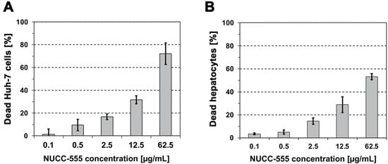 Human Huh-7 cells (kindly provided by Dr. Locker) were plated in 12-well plates (1 × 105 cells/3.65 cm2/well) and cultured in DMEM containing 10% fetal FBS. At day 2, cells were treated without or with various concentrations of NUCC-474 or NUCC-555 (0.1, 0.5, 2.5, 12.5, 62.5 µg/mL) for 48 h, followed by incubation with MTT (MTT assay, see Section 2.6).