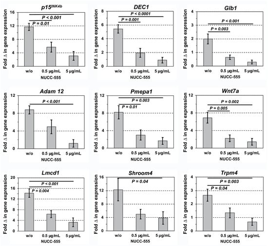 In our previous studies, we reported many overexpressed genes after activin A treatment in cultured rat hepatocytes []. Most of those genes were related to cell cycle arrest/senescence but not to apoptosis. Therefore, to test the potential of NUCC-555 in blocking activin A effects in rat hepatocytes, we cultured hepatocytes with activin A with or without NUCC-555 and analyzed mRNA extracts for selected gene expression. The genes of interest were p15INK4b, deleted in esophageal cancer 1 (DEC1), and galactosidase b 1 (Glb1) (key target genes of activin A signaling controlling proliferation/senescence in hepatocytes [,]. Because we also discovered several novel genes with different functions that are highly induced after activin A treatment in hepatocytes, we also tested the mRNA levels of ADAM metallopeptidase domain 12 (Adam12), prostate transmembrane protein, androgen-induced 1 (Pmepa1), Wnt family member 7a (Wnt7a), LIM and cysteine-rich domain 1 (Lmcd1), shroom family member 4 (Shroom4), and transient receptor potential cation channel, subfamily M, member 4 (Trpm4) []. Hepatocytes were cultured in HGM to stimulate cell proliferation and subsequently treated with recombinant human activin A (50 ng/mL) without or with NUCC-555 (0.5 and 5.0 µg/mL). These antagonist doses were used based on our in vitro studies (see Figure 1) showing a low cytotoxicity within this treatment range.