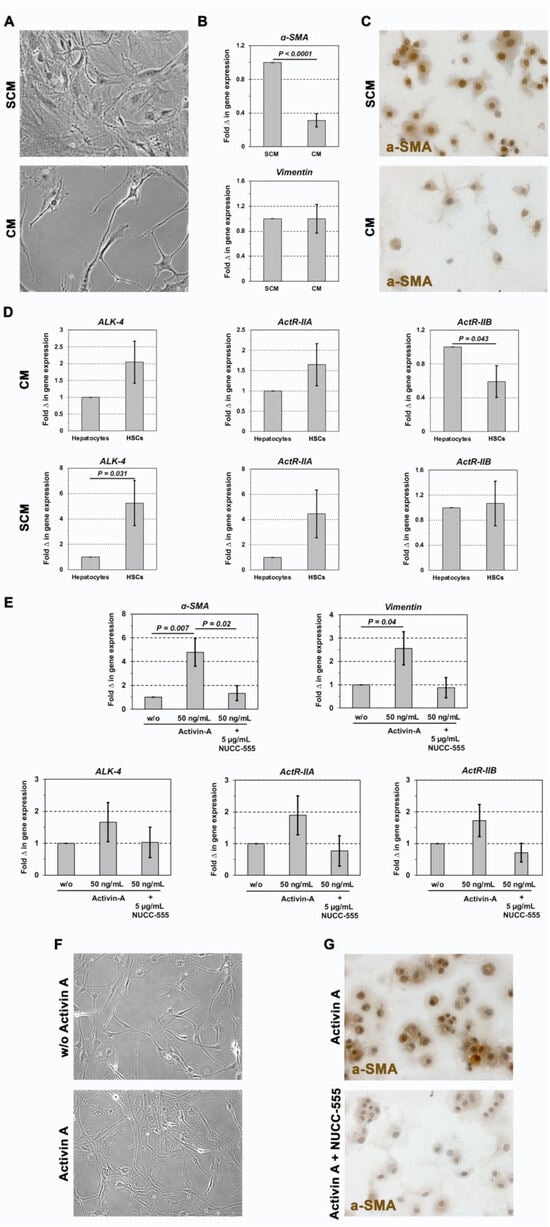 Blocking activin A signaling in HSCs. (A–D) Characterization of inactivated and activated HCSs. Activated rat HSCs (1 × 105 cells/well in triplicates), cultured in stellate cell medium (SCM) (A; upper panel), were inactivated in Clever’s medium (CM) (A; lower). (B) RNA extracts were analyzed by qRT-PCR and expression levels of selected HSC-specific genes were determined. Mean ± SEM values of 4 independent experiments (including two replicate PCR analyses, each) are expressed as fold changes in inactivated HCSs (in CM) with respect to activated HSCs (in SCM), set at a value of 1. (C) Immunocytochemistry for α-SMA on cytospins. (D) Activin receptor mRNA expression on inactivated (CM) and activated HSCs (SCM). Mean ± SEM values of 4 independent experiments (two replicate PCR analyses, each) are expressed as fold changes in mRNA expression compared to hepatocytes, set at a value of 1. (E–G) Blockage of activin A-induced HSC activation by NUCC-555. Activated HSCs were inactivated in CM for 4 days, followed by incubation without (w/o) activin A, with activin A, or activin A and NUCC-555 for 4 days thereafter. (E) qRT-PCR analyses for a-SMA, vimentin, and activin receptor mRNA. Mean ± SEM values of 4 independent experiments (two replicate PCR analyses, each) are expressed as fold changes in mRNA expression with respect to inactivated HSCs without any treatment, set at a value of 1. (F) Morphology of cultured HSCs in CM without or with 50 ng/mL activin A treatment. (G) Immunocytochemistry for α-SMA on cytospins. HSCs were cultured with 50 ng/mL activin A without or with 5 mg/mL NUCC-555. Original magnification, 100× (F) and 200× (A,C,G).