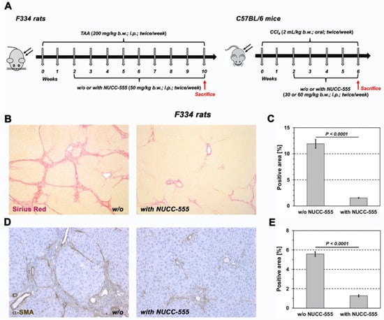 Two hundred mg/kg b.w. TAA was injected intraperitoneally into F344 rats (1.5 to 2 months of age) twice weekly for 10 weeks. After 2 weeks, NUCC-555 (50 mg/kg b.w.; dosage by Zhu et al. []) treatment was started and continued thereafter, twice a week. The control group received an equal volume of vehicle solution.
