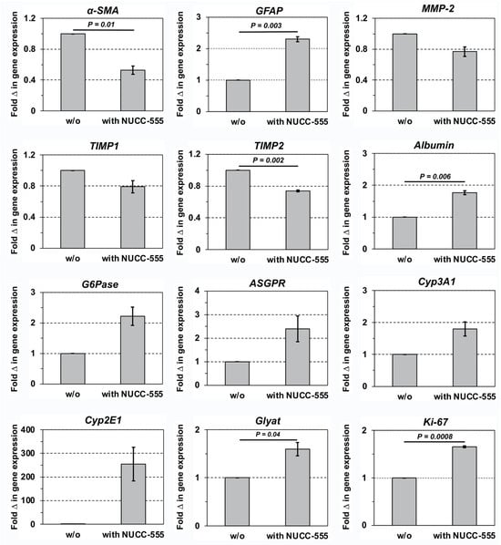 Having demonstrated that NUCC-555 can efficiently block activin A signaling in rat hepatocytes in vitro and in vivo, we next determined whether antagonizing activin A—which is involved in the pathogenesis of several human liver diseases and cancer patients [,,,,,,,]—can affect fibrogenesis and the extend of liver fibrosis. To induce fibrosis, 200 mg/kg TAA was injected twice weekly into 2-month-old F344 rats, weighing 237.18 ± 3.68 g. After two weeks, one group received NUCC-555 (50 mg/kg b.w.) twice a week. TAA administration was continued in rats with (n = 3 rats) and without activin A antagonist treatment (n = 4 rats) thereafter (Figure 5A, left panel). At 10 weeks after starting TAA treatment, histological examination of Sirius Red-stained liver sections from rats without NUCC-555 administration showed progressive liver injury leading to moderate fibrosis and beginning cirrhosis, reflected by tissue areas with nodularity caused by fibrous septa bridging portal areas (Figure 5B, left panel). In contrast, only mild fibrosis was observed in activin A-antagonized livers (Figure 5B, right panel). Quantification of Sirius-Red-stained collagen showed 7.9-fold less collagen accumulation in livers of NUCC-555-treated animals compared to control rats (1.5 ± 0.1% vs. 11.9 ± 0.8%; Figure 5C). Moreover, using immunohistochemical analyses for α-SMA and vimentin, a significantly reduced number of activated stellate cells were detected in NUCC-555-treated livers (Figure 5D–G). Moreover, we determined significantly reduced serum ALT, AST, and ALP levels in rats with NUCC-555 administration (Figure 5H). We also performed qRT-PCR analyses to determine the expression levels of genes relevant to fibrosis. We observed a marked decrease in a-SMA, matrix metalloproteinase-2 (MMP-2), tissue inhibitor of metalloproteinase-1 (TIMP1), and TIMP2 mRNA and up-regulation of glial fibrillary acidic protein (GFAP) in liver samples of TAA-treated rats with NUCC-555 compared to control rats (Figure 6), indicating a significant reduction of the fibrinogenic process by the activin A antagonist. In addition, liver samples derived from NUCC-555 animals showed higher albumin, glucose-6-phosphatase (G6Pase), asialoglycoprotein receptor (ASGPR), cytochrome 3A1 (Cyp3A1), Cyp2E1, and glycine-N-acyltransferase (Glyat) mRNAs, which are related to hepatocyte-specific cell functions (Figure 6). Moreover, we detected a 1.7-fold increased expression of Ki-67 mRNA (Figure 6), indicating increased numbers of proliferating cells in NUCC-555-treated rats.