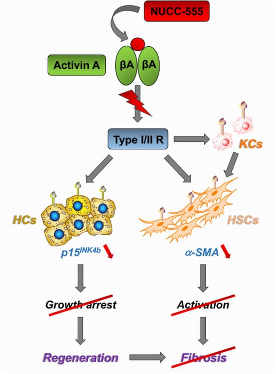 Progressive liver injury activates HSCs producing collagen that drives fibrosis, which results in impaired hepatocyte regeneration and function []. Fibrosis is a common consequence of many CLDs, the reversal of which remains a major clinical need. In recent studies, we showed that activin A plays a critical role in maintaining normal liver function []. There is growing evidence implicating that activin A is involved in the progression of CLDs [,,,,,,,]. However, therapeutic targeting of activin A signaling has not been successfully undertaken. In the present study, we evaluated the novel highly specific activin A antagonist NUCC-555 and made three major observations: First, we demonstrated that NUCC-555 sufficiently blocks the activin A/p15INK4b axis in hepatocytes. Moreover, we showed that HSCs express all activin A-specific receptors required for activin A-mediated HSC activation. Secondly, in partially hepatectomized rats, activin A blockage significantly increases the proliferative activity of hepatocytes. Third, small-molecule-based blockage of activin A signaling significantly attenuates fibrosis progression in chemical-induced rodent fibrosis models. These studies clearly demonstrate the beneficial effects of antagonizing activin A, using the novel small-molecule NUCC-555. Our findings represent a novel promising therapeutic strategy to block activin A-mediated events causing liver fibrosis.