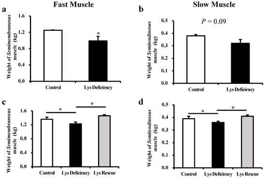 The piglets had reduced total muscle mass of both fast (1.25 ± 0.01 vs. 0.99 ± 0.11 kg; p < 0.05; Figure 1a) and slow (0.38 ± 0.01 vs. 0.32 ± 0.03 kg; p = 0.09; Figure 1b) muscles after being fed the Lys-deficient diet for two weeks, and this pattern continued until the study’s completion on d 29 (p < 0.05; Figure 1c,d). The supplementation of sufficient Lys in the diet for two weeks (d 15–29) reversed the detrimental effect that was induced by Lys deficiency in both types of muscle (semimembranosus muscle: 1.23 ± 0.05 vs. 1.46 ± 0.03 kg; p < 0.05; semitendinosus muscle: 0.36 ± 0.01 vs. 0.41 ± 0.01 kg in Lys deficiency and Lys rescue groups, respectively; p < 0.05; Figure 1c,d), indicating the essential role of dietary Lys in guarding the muscle development of nursery piglets.