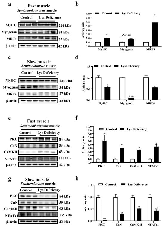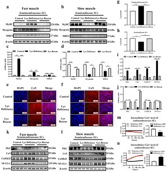 SCs isolated from both fast and slow muscles were studied to determine the myogenic differentiation mechanism in response to Lys deficiency. Consistently, Lys deficiency for 48 h mediated the MRFs in an opposite fashion between fast and slow muscle-derived SCs. It promoted the differentiation of modulating molecules in fast muscle SCs (Figure 4a,c; p < 0.05) and suppressed those expressions in slow muscle SCs (Figure 4b,d; p < 0.05). The immunofluorescence intensity of CaN/DAPI was upregulated in Lys-deficient cultured semimembranosus SCs (Figure 4e,g) but was significantly reduced in semitendinosus SCs (Figure 4f,h). Besides CaN, the protein expressions of other key molecules including PKC, CaMKII, and NFATc1 were also stimulated in semimembranosus SCs when cultured in the Lys-deficient medium (Figure 4i,k). However, the expressions of these molecules were all suppressed in expression in semitendinosus SCs under the same Lys-deficient condition (Figure 4j,l).