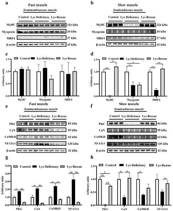 Lys re-supplementation restores the muscle differentiation and the repressed Wnt/Ca2+ pathway induced by Lys deficiency in slow muscle and suppresses the Wnt/Ca2+ pathway in fast muscle. Expression assays of MyHC and key proteins (Myogenin, and MRF4) of the myogenic factor family in fast (semimembranosus; a,c) and slow (semitendinosus; b,d) muscles on day 29 of the trial. Expression assays for key proteins of the Wnt/Ca2+ pathway (PKC, CaN, CaMKII, and NFATc1) in fast (semimembranosus; e,g) and slow (semitendinosus; f,h) muscles on test day 29. * indicates p < 0.05, ** indicates p < 0.01.
