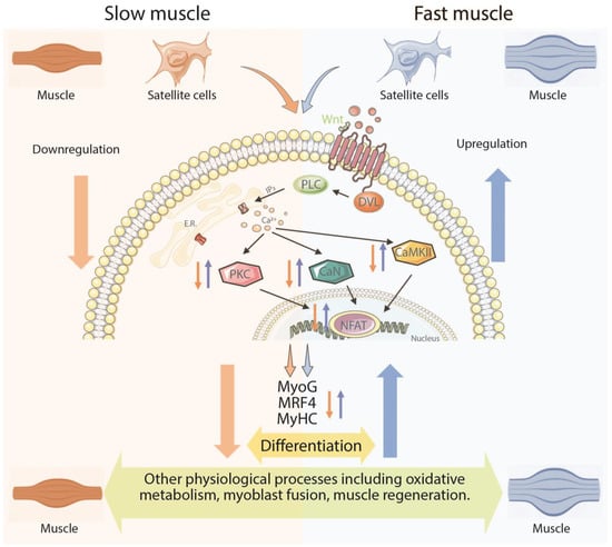Moreover, extensive studies have demonstrated the critical roles of both canonical Wnt/β-catenin and noncanonical Wnt/planar cell polarity (PCP) pathways in SC proliferation and symmetric amplification [,]. In 2018, Zhang et al. illuminated the indispensable role of Wnt/Ca2+ pathways to SC differentiation, which was recapitulated by the phenomenon that the expression of Wnt5a, the main Wnt/Ca2+ ligand, increases as SC differentiation continues []. However, the cellular Ca2+ concentration differing in slow and fast muscle cells potentially drives a different dependency on the Wnt/Ca2+ pathway and SC proliferation, and its underlying mechanism in different muscle types was overlooked before.