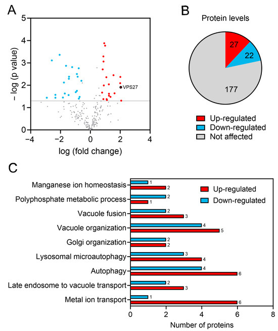 Proteomic analysis of sit4∆ vacuolar membranes. (A) Volcano plot for differentially expressed proteins in sit4∆ vs. wild-type samples. The log-transformed p-values (Student’s t-test) are plotted in the vertical axis against the log-transformed fold change on the horizontal axis. The horizontal dashed line indicates a p-value of 0.05. Red dots represent proteins that are upregulated with a 1.5-fold change threshold, whereas blue dots represent proteins that are downregulated (log2 fold change of ±0.58). Grey dots represent the unchanged proteins. Vps27 protein is identified with a red dot with a black outline. (B) Number of proteins significantly up- or downregulated in the sit4∆ vacuolar membranes. (C) GO term enrichment analysis on biological processes was conducted for proteins exhibiting statistical alterations in sit4∆ samples.