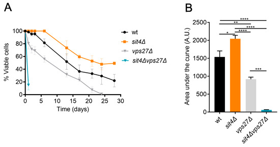 SIT4 deletion extends lifespan in a Vps27-dependent manner. (A) Cells were grown to PDS phase (24 h after Log; t0) and maintained over time in SC medium. Cellular viability was expressed as the percentage of CFUs (aged vs. t0). Data are the mean ± SEM (n ≥ 3). (B) The area under each lifespan curve was calculated using GraphPad and expressed in arbitrary units (A.U.). Data are the mean ± SEM (n ≥ 3); * p ≤ 0.05; ** p ≤ 0.01; *** p ≤ 0.001; ****, p ≤ 0.0001; one-way ANOVA.