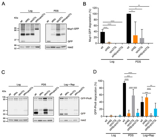 Vps27 is involved in ubiquitinated cargo recognition and subsequently in the recruitment of ESCRT-I, facilitating the sorting of ubiquitinated MVB cargo [65,66]. During nutrient depletion, e.g., during cell growth to PDS and stationary phases, the MVB pathway promotes intracellular amino acid homeostasis and the upregulation of vacuolar hydrolases [69]. In fact, the MVB pathway synergistically cooperates with autophagy to promote cell longevity following nutrient depletion [69,70]. This led us to assess if the enrichment of Vps27 in the sit4Δ vacuolar membranes results in MVB pathway induction.