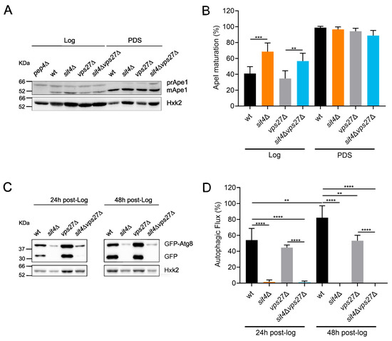 In addition to CPY, yeast uses the Cvt pathway, another biosynthetic trafficking pathway, to transport hydrolases, such as the Ape1, into the vacuole. For this, Cvt relies on the molecular machinery involved in autophagy [30]. To determine whether Cvt is altered in sit4Δ cells, we monitored Ape1 processing to its mature form. In the PDS phase, all strains exhibited near complete processing of Ape1 (Figure 5A,B). However, in the Log phase, sit4Δ cells had a 1.7-fold increase in Ape1 maturation compared to the parental strain. Moreover, Ape1 processing increased in the sit4Δvps27Δ mutant vs. vps27Δ cells, suggesting that the deletion of SIT4 increased the Cvt pathway in a Vps27-independent manner.