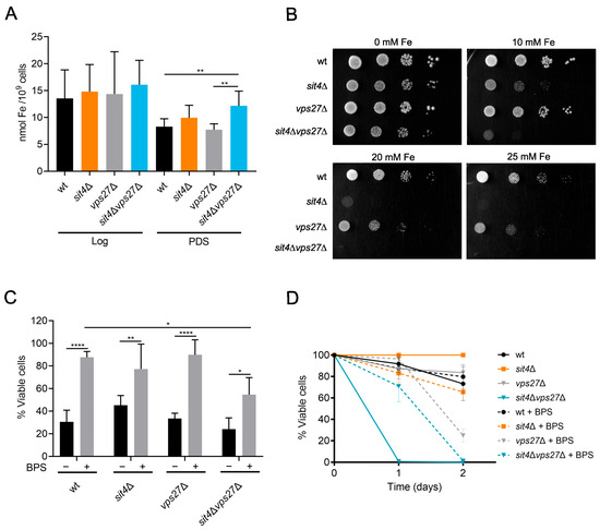 Our proteomic analysis from sit4Δ vacuolar membranes also identified alterations in proteins involved in iron trafficking, namely in Smf3, Ccc1, and Fth1 (Tables S1 and S2). It is known that Vps27 impacts iron homeostasis by controlling the degradation of iron transporters. Under high iron conditions, iron transporters are sorted into vesicles by ESCRT-0 and the MVB pathway, to be degraded in vacuoles [83]. This prompted us to investigate whether VPS27 deletion affects iron homeostasis, contributing to the shortened CLS of sit4Δvps27Δ cells. The results showed that iron levels were similar in all strains at the Log phase (Figure 6A). However, at the PDS phase, the sit4Δvps27Δ mutant exhibited higher levels of iron. This result led us to evaluate the sensitivity of cells to grow in medium supplemented with iron. We found that sit4Δ cells exhibited a higher sensitivity to iron supplementation that was aggravated by VPS27 deletion (Figure 6B). VPS27 deletion in sit4Δ cells may decrease the degradation of iron transporters, leading to the observed high iron levels and iron sensitivity. We hypothesized that iron accumulation leads to iron toxicity, contributing to the premature aging of sit4Δvps27Δ cells. To examine this, we evaluated the impact of iron chelation with BPS, known to cause intracellular iron deprivation, on oxidative stress resistance and CLS. To assess oxidative stress resistance, cells grown in SC medium with or without BPS were treated with 1.5 mM H2O2. Our data show that sit4Δvps27Δ cells did not exhibit increased sensitivity to H2O2 (Figure 6C). Moreover, BPS decreased the H2O2 sensitivity in all strains, but this protective effect was lower in sit4∆vps27∆ mutant cells, suggesting that iron accumulation does not aggravate H2O2 sensitivity. Moreover, BPS had a minor effect on the CLS of sit4Δvps27Δ cells as it only increased cell survival from 1 to 2 days (Figure 6D). Overall, these findings suggest that iron accumulation does not seem to be a primary contributing factor to the drastic viability loss of sit4Δvps27Δ cells.