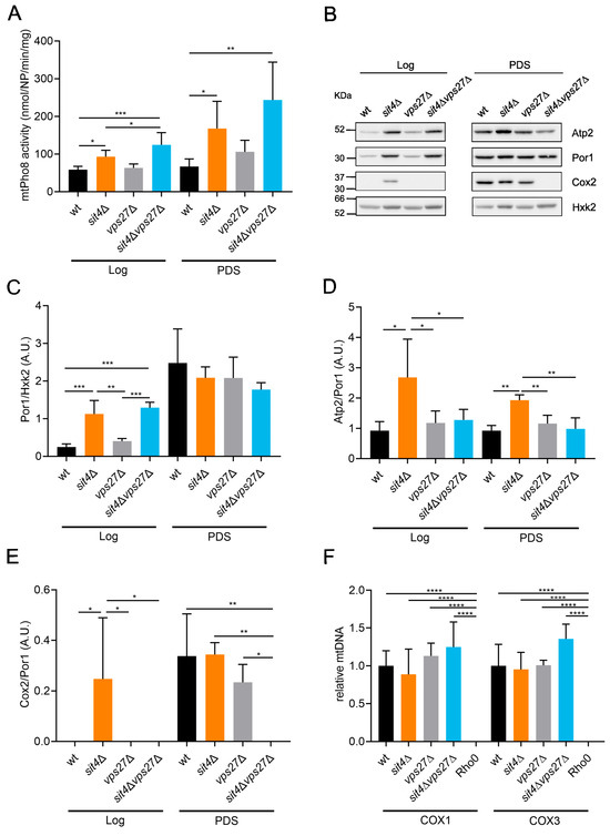 Numerous studies support a key role of vacuolar trafficking pathways, such as autophagy and mitophagy, in mitochondrial fitness. Mitophagy is a selective type of autophagy that targets damaged mitochondria for degradation in vacuoles. Along with mitochondrial dynamics, mitophagy is of central importance to the sustainment of mitochondrial integrity and activity [93,94,95,96]. This led us to investigate whether Vps27 is involved in the modulation of mitophagy and mitochondrial biogenesis in cells lacking Sit4. Mitophagy was assessed in cells expressing the vacuolar alkaline phosphatase Pho8 targeted to mitochondria (mtPho8) [97]. Since maturation of the Pho8 pro-enzyme requires vacuolar Pep4, the alkaline phosphatase activity is an indicator of mitochondrial degradation in vacuoles. Our results show that the alkaline phosphatase activity was higher in cells lacking Sit4 at the Log and PDS phases, although in a Vps27-independent manner (Figure 8A). In fact, we even observed higher activity in sit4Δvps27Δ cells at the Log phase compared to sit4Δ cells. This indicates that the mitochondrial respiration defects in the double mutant sit4Δvps27Δ are not associated with impaired mitophagy. Moreover, these findings suggest that enhanced mitophagy activity in sit4Δ cells is not associated with Vps27-dependent CLS extension.