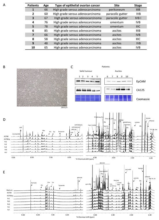 Characterization of HGSOC cells. (A) main features of the donors; (B) bright field image of representative HGSOC cells (scale bar = 264.6 µm) (C) western blot analysis of protein extracts of HGSOC cells showing the expression of EpCAM and CA125 proteins as measured using specific antibodies. Representative 1H NMR CPMG spectra of (D) cell lysates (endo-metabolome) and (E) growth media (exo-metabolome) of HGSOC_T cells and HSGOC_A in comparison with A2780 and A2780cis (left: downfield, 5.00–9.00 ppm; right: upfield, 1.00–4.50 ppm). Spectra were recorded at 600 MHz and 300 K. All metabolites that have been identified in the spectra are indicated.