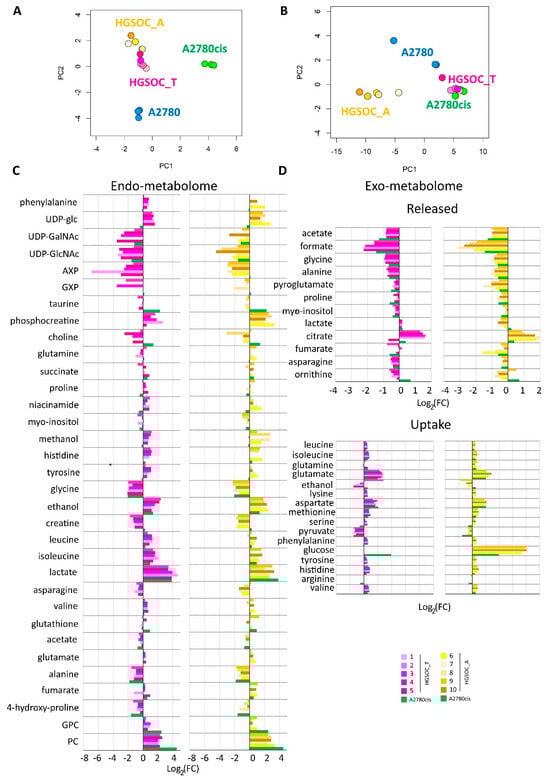 Figure 3C,D clearly show the differences in the relative amount of the intracellular and extracellular metabolites in HGSOC_T, HGSOC_A, and A2780cis cells with respect to A2780 cells.