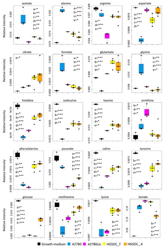 Box plots showing the relative concentration of extracellular metabolites that result significantly altered in the different cell lines. Color coding: A2780 (blue), A2780cis (magenta), HGSOC_T (yellow), HGSOC_A (orange), growth medium(black). The letters a–f indicate the different comparisons, i.e., a = A2780 vs. A2780cis; b = A2780 vs. HGSOC_T; c = A2780 vs. HGSOC_A; d = A2780cis vs. HGSOC_T; e = A2780cis vs. HGSOC_A; f = HGSOC_T vs. HGSOC_A. * indicates 0.05 < p-value < 0.01; ** indicates 0.01 < p-value < 0.001; *** indicates p-value > 0.001.