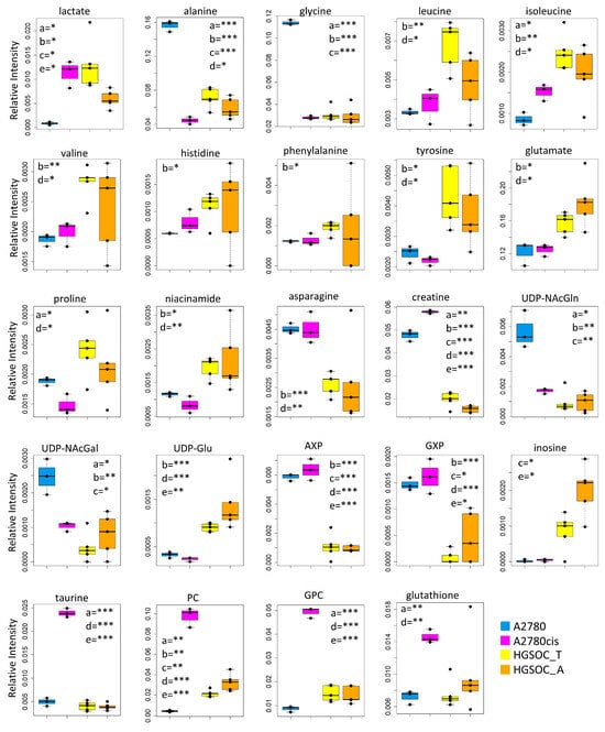 Box plots showing the relative concentration of intracellular metabolites that result significantly altered in the different cell lines. Color coding: A2780 (blue), A2780cis (magneta), HGSOC_T (yellow), HGSOC_A (orange). The letters a–e indicate the different comparisons, i.e., a = A2780 vs. A2780cis; b = A2780 vs. HGSOC_T; c = A2780 vs. HGSOC_A; d = A2780cis vs. HGSOC_T; e = A2780cis vs. HGSOC_A. * indicates 0.05 < p-value < 0.01; ** indicates 0.01 < p-value < 0.001; *** indicates p-value > 0.001.