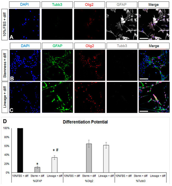 Investigation of the differentiation potential of mature and de-differentiated astrocytes. (A) Images of astrocytes generated after a 7-day culture in DMEM+ 10%FBS and then being differentiated for another 5 days in supplemented serum-free, growth-factor-free DMEM immunostained for β3-tubulin (Tubb3, to mark neurons, in green), Olig2 (to mark oligodendroglial lineage cells, in red), and GFAP (in grey). (B,C) Images of astrocytes de-differentiated for 7 days in two different media and then differentiated for another 5 days in supplemented serum-free, growth-factor-free DMEM immunostained for GFAP (in green), Olig2 (in red), and Tubb3 (in grey). (D) Graph showing the marker profile quantification of cells grown in the different media after 5 days of differentiation. [Scale bars: 20 μm; (D) *: p < 0.05 for comparisons to the 10%FBS medium and #: p < 0.05 for comparisons to the stemness medium; one-way ANOVA followed by post hoc analysis].