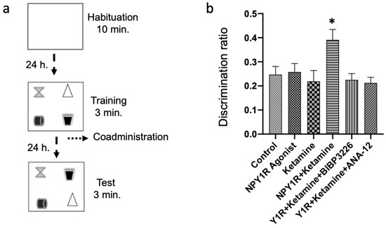 Evaluating spatial memory following the combined intranasal administration of the NPY1R agonist and Ketamine in the object-in-place memory task. (a) A schematic representation of the sequential phases in the object-in-place memory task, spaced 24 h apart. The habituation phase allows for free exploration without objects for ten minutes. The training phase then introduces four different objects for a three-minute exploration period. Finally, the test phase involves a three-minute exploration with two of the original objects switched in position. (b) Performance metrics for the object-in-place task, demonstrating the capacity of rats to discern the switched objects after three weeks of intranasal infusion with the NPY1R agonist and Ketamine. Notably, the co-administration of NPY1R (Y1R receptor agonist [Leu31-Pro34]NPY, 132 µg) and Ketamine (10 mg/kg) resulted in improved performance on the object-in-place task. However, this enhancement was counteracted by the addition of BIBP3226 (NPY1R antagonist, 132 µg) or ANA-12 (TrkB antagonist, 0,5 mg/kg). Data are expressed as the mean ± SEM of the discrimination ratio during the test phase (n = 6 animals per group). * p < 0.05, indicating a significant difference compared to the rest of the groups, as determined by the one-way ANOVA and post hoc Newman–Keuls test. Abbreviations: Control = distilled water; NPY1R Agonist = neuropeptide Y1 receptor agonist [Leu31, Pro34]NPY (132 µg); Ketamine = administration of Ketamine (10 mg/kg); NPY1R + Ketamine = co-administration of NPY1R agonist and Ketamine; NPY1R + Ketamine + BIBP3226 = co-administration of NPY1R agonist, Ketamine, and NPY1R antagonist BIBP3226 (132 µg); NPY1R + Ketamine + ANA-12 = co-administration of NPY1R agonist, Ketamine, and TrkB antagonist ANA-12 (0.5 mg/kg).