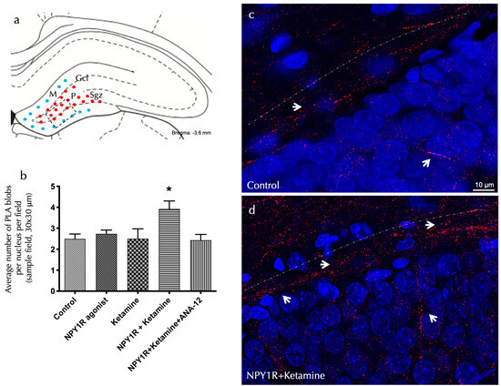 The visualization of NPY1R/TrkB heteroreceptor complex formation in the dorsal hippocampal DG via a proximity ligation assay. The identification of NPY1R/TrkB heteroreceptor complexes within the dorsal hippocampal dentate gyrus (DG) through the application of the in situ proximity ligation assay (PLA). This innovative technique allows for the direct observation of protein–protein interactions in close proximity, utilizing highly specific primary antibodies targeted at each protein. The assay highlights the following: (a) The presence of PLA-positive signals (shown as red dots) primarily within the subgranular zone (SGZ) of the DG, delineating the interface between the granule cell layer (GCL) and the polymorphic layer (PL) in the dorsal hippocampus. These signals extend into the PL, with the molecular layer (ML) characterized by the absence of PLA signals (indicated by blue dots). The anatomical landmarks correspond to the Bregma −3.6 mm coordinate according to the Paxinos and Watson [54] stereotaxic atlas. (b) A quantitative analysis of PLA signals in the SGZ involved counting the red PLA-positive spots per nucleus in each field, carried out by an analyst blind to the experimental conditions. (c,d) Representative images showcase a marked elevation in the density of red PLA blobs indicative of NPY1R/TrkB heteroreceptor complexes in the SGZ following the co-administration of the NPY1R agonist and Ketamine, relative to the control group. These complexes are depicted as red PLA blobs (clusters) with high densities per cell across numerous neurons, visualized using confocal laser microscopy. Statistical annotations include * p < 0.05, indicating a significant difference compared to the rest of the groups, as determined by the one-way ANOVA and Newman–Keuls post hoc test (n = 4). Vertical lines above bars facilitate inter-group comparisons. Data are presented as the mean ± SEM for four rats per group, in duplicates. In our visual representations, white arrows highlight the presence of PLA-positive clusters, indicative of protein interactions detected by the proximity ligation assay. Dashed lines demarcate the granule cell layer (GCL) of the dentate gyrus (DG), providing a structural reference for the observed molecular interactions. Additionally, nuclei have been counterstained in blue with DAPI, offering contrast and clarity to the cellular components within the tissue sections. Abbreviations: Control = distilled water; NPY1R agonist = neuropeptide Y1 receptor agonist [Leu31, Pro34]NPY (132 µg); Ketamine = administration of Ketamine (10 mg/kg); NPY1R+Ketamine = co-administration of NPY1R agonist and Ketamine; NPY1R+Ketamine+BIBP3226 = co-administration of NPY1R agonist, Ketamine, and NPY1R antagonist BIBP3226 (132 µg); NPY1R+Ketamine+ANA-12 = co-administration of NPY1R agonist, Ketamine, and TrkB antagonist ANA-12 (0.5 mg/kg).