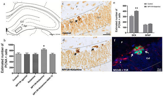 Using proliferating cell nuclear antigen (PCNA) staining, we investigated the combined effect of the NPY1R agonist and Ketamine on cell proliferation within the adult dorsal hippocampus, focusing specifically on the subgranular zone (SGZ) of the dentate gyrus. A significant increase in cell proliferation was observed with the co-administration of these compounds, as evidenced by the heightened presence of PCNA-immunoreactive (PCNA-IR) cells in comparison to control and other experimental groups (one-way ANOVA, F4, 15 = 3.81, p < 0.05; Newman–Keuls post hoc test: p < 0.05) (Figure 3a,b,d).