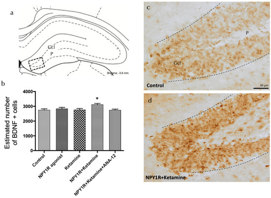 Enhancing BDNF expression in the dorsal dentate gyrus through the co-administration of the NPY1R agonist and Ketamine. Effects of co-administering an NPY1R agonist and Ketamine on the distribution of brain-derived neurotrophic factor immunoreactive (BDNF-IR) cells within the dorsal dentate gyrus (DG) of the hippocampal region. Panel (a) highlights that BDNF-IR cells are predominantly found in the granule cell layer (GCL) of the DG, with a sparse presence in the polymorphic layer (P), corresponding to the Bregma −3.6 mm location as per the Paxinos and Watson stereotaxic atlas [54]. Panel (b) quantitatively demonstrates a significant upsurge in BDNF-IR cells in the dorsal DG following the co-administration of the NPY1R agonist and Ketamine. The application of the TrkB antagonist ANA-12 is shown to counter this effect. Statistical significance is indicated by * p < 0.05 compared to the rest of the groups, as established by the one-way ANOVA and subsequent Newman–Keuls post hoc testing (n = 4 per group). The graph’s vertical lines above bars facilitate inter-group comparison. Data are depicted as the mean ± SEM. Panels (c,d) provide representative images showcasing the notable enhancement in BDNF-positive cells in the DG after the co-administration of the NPY1R agonist and Ketamine (d), relative to the control group treated with distilled water (c). Dashed lines mark the GCL boundaries within the DG. Abbreviations: Control = distilled water; NPY1R agonist = neuropeptide Y1 receptor agonist [Leu31, Pro34]NPY (132 µg); Ketamine = administration of Ketamine (10 mg/kg); NPY1R + Ketamine = co-administration of NPY1R agonist and Ketamine; NPY1R + Ketamine + BIBP3226 = co-administration of NPY1R agonist, Ketamine, and NPY1R antagonist BIBP3226 (132 µg); NPY1R + Ketamine + ANA-12 = co-administration of NPY1R agonist, Ketamine, and TrkB antagonist ANA-12 (0.5 mg/kg).