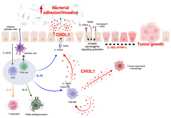 Conceptual representation of the putative effects of CHI3L1 in chronic inflammation within epithelial cells: Bacterial binding to epithelial cells triggers the production of pro-inflammatory cytokines. This inflammatory cascade results in the upregulation of CHI3L1 expression in epithelial cells. Additionally, innate lymphoid cells type 2 (ILC2) and Th2 cells initiate a Th2 inflammation in response to epithelial cell inflammation. Th2 inflammation further promotes the polarization of M0 macrophages towards the M2 phenotype. IL-13 plays a crucial role in inducing CHI3L1 expression in both epithelial cells and M2 macrophages. Elevated CHI3L1 expression in epithelial cells enhances bacterial adhesion and sustains chronic inflammation. Soluble CHI3L1 binds to several receptors, including IL-13Rα2, RAGE, and syndecan I on epithelial cells and macrophages. Moreover, chronic inflammation mediated by CHI3L1 leads to tumorigenesis, contributing to the establishment of a tumor-promoting microenvironment. Created with BioRender.com (accessed on 19 February 2024).