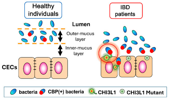 Intestinal microflora and host colonic epithelial cells’ (CEC) interactions in healthy individuals versus inflammatory bowel disease (IBD) patients: In healthy individuals, CEC is protected by two (outer- and inner-) mucus layers, and intestinal bacteria cannot access CECs. In contrast, in IBD patients, disruption of these mucus layers causes the chitin-binding protein of potentially pathogenic bacteria to bind to glycosylated CHI3L1 expressed on CEC, allowing these bacteria to adhere and invade. Non-glycosylated mutant form of CHI3L1 shows less bacterial binding in vitro.