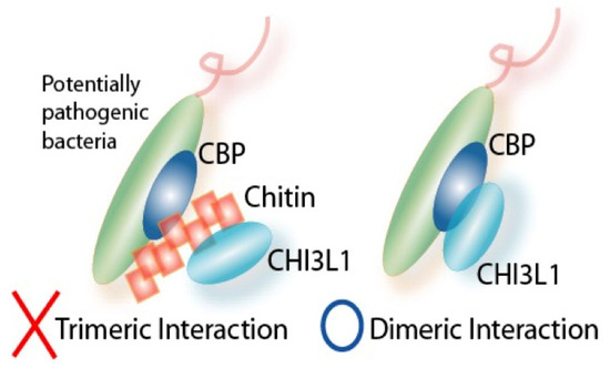Schematic representation on putative trimeric- and dimeric-interaction theories: Our current hypothesis is based on a dimeric interaction theory (a direct interaction of host N-glycosylated CHI3L1 protein and bacterial chitin-binding protein) but not a trimeric interaction theory (chitin or chitin-like oligosaccharides link CHI3L1 protein and chitin-binding protein together make those trimeric complex).
