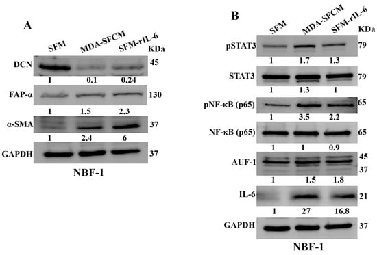 Next, we wanted to know whether BC cells can downregulate DCN in breast fibroblasts and the role of IL-6 in this process. To this end, NBF-1 cells were incubated with either serum-free medium (SFM) or SFM containing rIL-6 (3.5 ng/mL) or serum-free conditioned medium (SFCM) collected from the highly invasive breast cancer cells MDA-MB-231 (SFM, SFM-rIL-6 and MDA-SFCM, respectively). Whole cell lysates were prepared and were used for immunoblotting analysis utilizing GAPDH as an internal control. The endogenous DCN level was reduced 10-fold and 4.1-fold in fibroblast cells treated with MDA-SFCM and SFM-rIL-6 compared to controls, respectively (Figure 2A). By contrast, the level of two main biomarkers of active fibroblasts α-SMA and FAP-α were increased in cells treated with MDA-SFCM and rIL-6 compared to controls (Figure 2A). This indicates that breast cancer cells and rIL-6 downregulated DCN and activated NBFs. To delineate the molecular pathway that mediates MDA-SFCM- and rIL-6-related DCN downregulation and activation of NBFs, we first tested the effect of these two factors on the two major transcription factors STAT3 and NF-κB. The levels of the active forms of both STAT3 and NF-κB increased in cells expressing low levels of DCN compared to controls, while the basal levels were not affected (Figure 2B). This led to the activation of the downstream effectors IL-6 and AUF-1, a master regulator of all activation biomarkers [8,24,25] (Figure 2B). This indicates that breast cancer cells can downregulate DCN and activate NBFs in an IL-6-dependent manner, through the activation of STAT3/NF-κB signaling.