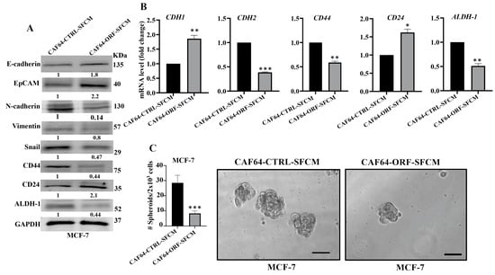 Next, we investigated the effect of CAF64-ORF-SFCM on the stemness features of MCF-7 breast cancer cells. Figure 8A shows a clear downregulation of CD44 and ALDH-1, while CD24 was upregulated in MCF-7 cells treated with CAF64-ORF-SFCM relative to CAF64-CTRL-SFCM. This was confirmed at the mRNA level (Figure 8B). To further investigate the paracrine effect of DCN upregulation in CAF cells on the stemness features of MCF-7 cancer cells, we treated MCF-7 cells with SFCM from CAF64-CTRL or CAF64-ORF cells, and then the treated cells were seeded in an ultralow-attachment 96-well plate containing a stem-cell-specific medium. Ten days later, spheroids with size ≥ 100 μm were counted. The MCF-7 cells treated with CAF64-ORF-SFCM exhibited a clear decrease in the number of spheroids relative to the control cells (CAF64-CTRL-SFCM). These results indicate that upregulation of DCN in CAF cells suppresses their pro-EMT and pro-stemness capacities. Together, these findings show that DCN upregulation suppresses the active features of breast CAFs and their pro-carcinogenic effects.