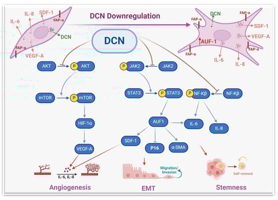 The other important pro-carcinogenic/metastatic process is angiogenesis, which is promoted and enhanced by active CAFs [6]. We have shown that DCN downregulation in BSFs promotes the differentiation of endothelial cells into cavities in a paracrine manner. This was confirmed by showing that DCN downregulation increases the expression and secretion of the main pro-angiogenic molecules VEGF-A, IL-8, IL-6 and SDF-1. On the other hand, DCN ectopic expression repressed the expression and secretion of SDF-1, IL-6, IL-8 and VEGF-A. It has been previously shown that CAFs promote vascular invasion of hepatocellular carcinoma through DCN downregulation [40]. To further confirm the role of DCN in angiogenesis and delineate the signaling pathway, we have shown that DCN downregulation activates the AKT signaling and its downstream protein kinase mTOR and its major effector HIF-1α (Figure 6). This indicates that DCN downregulation activates the pro-angiogenic potential of BSFs through the activation of the AKT signaling pathway and its downstream pro-angiogenic effectors VEGF-A, IL-8, IL-6 and SDF-1 (Figure 9). Similarly, it has been previously shown that decorin negatively regulates the expression of VEGF-A and HIF-1α in breast cancer cells [42].