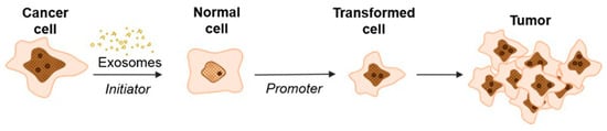 According to this hypothesis, exosomes secreted by cancer cells, upon being internalized into normal cells, initiate the development of mutations but are not yet able to cause complete transformation into a tumor cell. In this case, exosomes replaced the genotoxic carcinogen 3-MCA (3-methylcholanthrene) that was used as a control and induced random genetic change. During the second stage, the influence of TPA (12-O-tetradecanoylphorbol 13-acetate) enhanced the proliferation in the initiated cells selectively, thus driving malignant transformation of the cells [37,64]. These data are consistent with the studies of Abdour and colleagues, who showed that oncosuppressor genes can work as protectors from the absorption of cancer EVs and, accordingly, from subsequent malignant transformation [64]. In their study, BRCA1 knockout fibroblasts were more susceptible to exosomes isolated from the serum of patients with various tumor locations (colorectal cancer [CRC], hepatocellular carcinoma [HCC], pancreatic cancer [PC], and ovarian cancer) [37]. The treatment led to the malignant transformation of fibroblasts into tumors with the feature of highly proliferative adenocarcinoma. Moreover, the transformed fibroblasts showed signs of a primary tumor: the expression of epithelial markers typical of colorectal adenocarcinoma (CK7, positive for CEA, CK20, CDX-2, and AE1/AE3), markers reflecting early differentiation into pancreatic cancer (positive for cytokeratin CK19 and AE1/AE3, CK7 focal positive patches), and ovarian cancer markers positive for WT-1 and EMA. Interestingly, fibroblasts with wild-type BRCA1 did not transform into cancer cells.