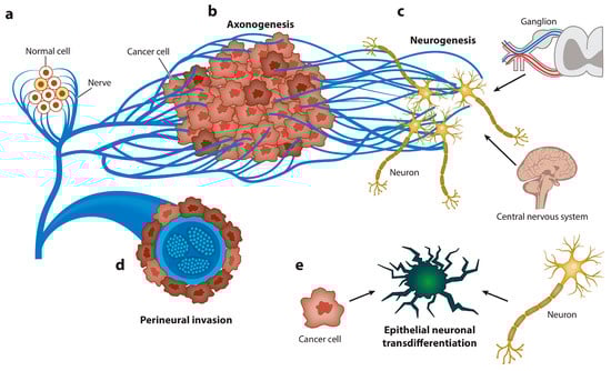 Graphical representation of the spectrum of neuroepithelial interactions. Cancer recapitulates the biology of the neural regulation of epithelial tissues. (a) Nerves regulate the homeostasis and energetic metabolism of normal epithelial cells. (b) Axonogenesis from pre-existing nerves takes place to supply the new malignant epithelial growth. Cancer cells rarely develop in denervated organs, and denervation affects tumorigenesis in vivo and in humans. (c) Neurogenesis occurs later, first in ganglia around organs or the spinal column and, subsequently, through recruitment of neuroblasts from the central nervous system. The hallmark of this stage is the regulation of homeostasis and energetic metabolism. (d) Perineural invasion is the most efficient interaction between cancer cells and nerves. The hallmarks of this stage are increased proliferation and decreased apoptosis. (e) Finally, carcinoma cells transdifferentiate into a neuronal profile to gain neural independence [167].