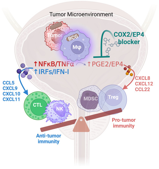 BCG-driven activation of the bladder cancer TME involves the NFκB/TNFα signaling pathway and IRFs/IFN pathway. While the IRF/IFN pathway selectively induces the chemokines attracting the desirable effector cells, the NFκB/TNFα pathway enhances the induction of both the CTL-attracting cytokines, CCL5, CXCL9, CXCL10, and CXCL11, but also amplifies the undesirable COX2/PGE2/EP4 pathway, which orchestrates the induction, activation, and recruitment of MDSCs and Tregs, through chemokines such as CXCL8, CXCL12, and CCL22. The combination of BCG with COX2- or EP4 blockers can selectively augment the attraction of CTLs while neutralizing PGE2-dependent suppressive factors and Treg and MDSC attractants, suggesting its potential to augment effective anti-tumor immunity in response to BCG treatment.