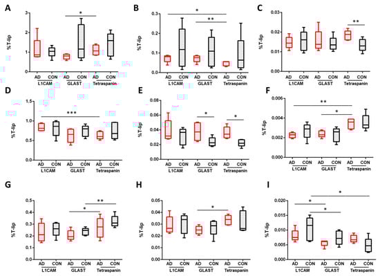 Percentage differences for selected glycerophospholipid species in EV subtypes of AD and control samples. (A) PC 38:0, (B) PE 36:0, (C) PE 36:1, (D) PA 40:6, (E) PS 36:0, (F) PS 36:1, (G) PI 40:4, (H) PG 36:0, (I) PG 38:0. L1CAM are neuronal EVs; GLAST are astrocyte EVs; Tetraspanin-EVs are multi-origin EVs (CD81, CD9, CDC3, surrogate of all-cell origin). The values are given as mean ± SD (n = 5). Statistical significance: * (p < 0.05), ** (p < 0.01). For specific values, see Table S3.
