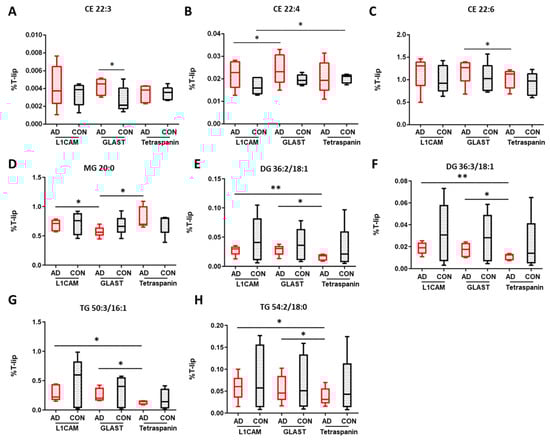 Percentage differences for selected cholesterol esters (CE) and glycerolipid species in EV subtypes of AD and control samples. (A) CE 22:3, (B) CE 22:4, (C) CE 22:6, (D) MG 20:0, (E) DG 36:2/18:1, (F) DG 36:3/18:1, (G) TG 50:3/16:1, (H) TG 54:2/18:0. L1CAM are neuronal EVs; GLAST are astrocyte EVs; Tetraspanin-EVs are multi-origin EVs (CD81, CD9, CDC3, surrogate of all-cell origin). The values are given as mean ± SD (n = 5). Statistical significance: * (p < 0.05), ** (p < 0.01). For specific values, see Table S3.