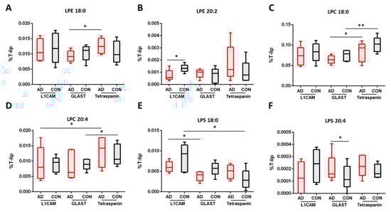 Percentage differences for selected lysophospholipid species in EV subtypes of AD and control samples. (A) LPE 180, (B) LPE 20:2, (C) LPC 18:0, (D) LPC 20:4, (E) LPS 18:0, (F) LPS 20:4. L1CAM are neuronal EVs; GLAST are astrocyte EVs; Tetraspanin-EVs are multi-origin EVs (CD81, CD9, CDC3, surrogate of all-cell origin). The values are given as mean ± SD (n = 5). Statistical significance: * (p < 0.05), ** (p < 0.01). For specific values, see Table S3.