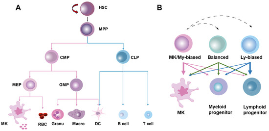 However, recent advances in single-cell lineage tracing and sequencing technologies have delineated a tremendous heterogeneity within HSCs at both the molecular and functional levels. Based on the molecular signature and lineage output of myeloid versus lymphoid cells, HSCs can be classified into myeloid-biased, balanced, and lymphoid-biased HSCs, with megakaryocyte (MK)/platelet-biased HSCs being identified as a subset of myeloid-biased HSCs positioned at the apex of the hematopoietic hierarchy [13,14]. In the heterogeneous HSC population, lineage-biased HSCs are distinguished by a skewed production of megakaryocytes/platelets and myeloid or lymphoid cells while retaining their multi-lineage potential, whereas balanced HSCs produce all lineages of blood cells roughly equivalently (Figure 1B). These exciting studies indicate that lineage separation actually occurs earlier than anticipated in the classical hematopoietic hierarchy, seemingly at the HSC level [14]. Moreover, tracing HSC emergence via single-cell sequencing has revealed that the lineage separation of HSCs may occur as early as the embryonic phase [15]. Notably, it was recently reported that the lineage differentiation of megakaryocytes is quite distinct from that of other lineages as HSCs’ commitment into megakaryocytes can bypass traditional lineage checkpoints and directly give rise to megakaryocytes independent of other lineages [16] (Figure 1B).