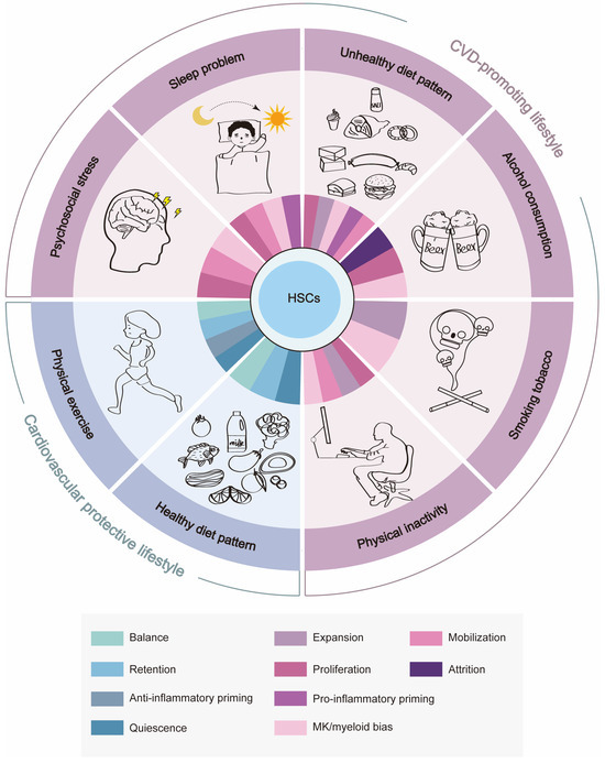 At present, emerging cardiovascular risk factors that mainly arise from unhealthy lifestyle factors, such as psychosocial stress, sleep problems, an unhealthy diet pattern, physical inactivity/sedentary behavior, alcohol consumption, and tobacco smoking, are increasingly attracting attention [3]. Below, we review how alterations in HSC homeostasis could link these lifestyle factors to CVD pathogenesis (Table 1).