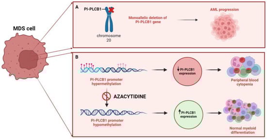 Abnormalities in phosphoinositide-dependent signaling, epigenetic regulators, apoptosis, and cytokine interactions within the bone marrow microenvironment are defining features that contribute to the pathogenesis of diseases and neoplastic growth of MDS [53] (Figure 1). Among the enzymes of the nuclear PI cycle, nuclear PI-PLCβ1 plays a fundamental role in the regulation of hematopoietic differentiation, that seems to be related to the recruitment of Myeloid zinc finger-1 (MZF-1) [28], and suggests that this enzyme has a significant impact on the initiation and progression from MDS to AML by affecting both genetic and epigenetic processes [54,55,56]. Through fluorescence in situ hybridization (FISH), an analysis of 80 MDS cases unveiled that 43.75% of patients displayed a monoallelic deletion in the PLCB1 gene situated on chromosome 20p12 [57,58]. In contrast, the PLCB4 gene, encoding another signaling molecule and positioned on 20p12.3 within 1Mb of PLCB1, remained unaffected, even in MDS patients exhibiting the deletion of the PLCB1 gene, suggesting a distinct and interstitial deletion pattern for PLCB1 [57,58]. Interestingly, it has been demonstrated that the monoallelic deletion of PLCB1 gene correlates with adverse clinical outcomes and an increased risk of AML development both in high- and low-risk MDS patients [58].