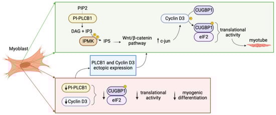 The most studied muscle diseases with impaired PI-PLCs expression level, specifically PI-PLCβ1, are myotonic dystrophies (DM), the most common muscular dystrophies in adults [69]. They are autosomal dominant progressive multisystem disorders, which can indeed affect other non-skeletal muscle organs such as the heart, brain and gastrointestinal system. DM is divided in two subtypes: DM type 1 and type 2, both dominantly inherited with significant overlap in clinical manifestations such as myotonia, muscle weakness, insulin resistance, cardiac conduction defects, cataracts, cognitive dysfunction, and mental retardation. They are instead distinguished by the pathological origin: DM1 is triggered by the pathological expansion of a CTG triplet repeat in the gene coding for dystrophia myotonica-protein kinase (DMPK), while DM2 by a CCTG tetranucleotide repeat expansion in the ZNF9 gene, which encodes a CCHC-type zinc-finger protein [70]. These expansions alternate the signaling pathway downstream the CUG triplet repeat RNA-binding protein 1 (CUGBP1), which plays a central role in alternative splicing of specific target genes and can interact with eukaryotic initiation factor 2 (eIF2) and cyclin D3 inducing normal myogenic differentiation. In normal myotubes, cyclin D3-cyclin dependent kinase 4/6 (cdk4/6) mediate the phosphorylation of CUGBP1, increasing the interactions of CUGBP1 with eIF2 enabling translational function during normal myogenesis [71]. In DM-differentiating cells, we assist with multiple alterations leading to ineffective myogenesis: CUGBP1-eIF2 interactions are reduced and both PI-PLCβ1 and cyclin D3 expression are decreased [72]. Figure 2 shows physiological and pathological myogenic differentiation.