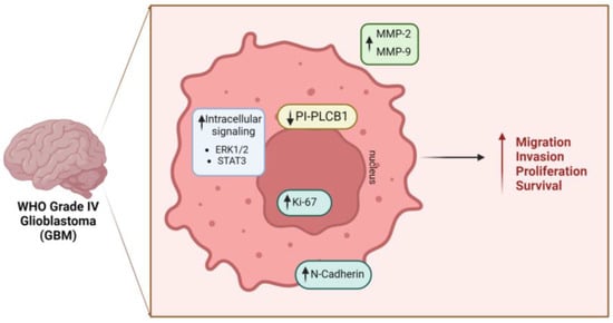 Notably, there is substantial evidence suggesting the involvement of PI metabolism in the development of Glioblastoma Multiforme (GBM), highlighting the intricate interplay between PI-PLCs and other mediators regulating cell proliferation, differentiation, migration, and growth [86,87,88] (Figure 3). GBM represents a grade IV astrocytoma, distinguished by its diverse cellular composition, genetic instability, extensive infiltration, angiogenesis, and resilience against existing treatments [89]. GBM can arise either spontaneously or progress from a pre-existing astrocytoma, both scenarios carrying a bleak prognosis. Despite ongoing efforts, current therapies for GBM exhibit limited efficacy, with only a small fraction of patients—approximately 3–5%—surviving beyond three years [90].